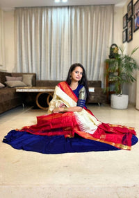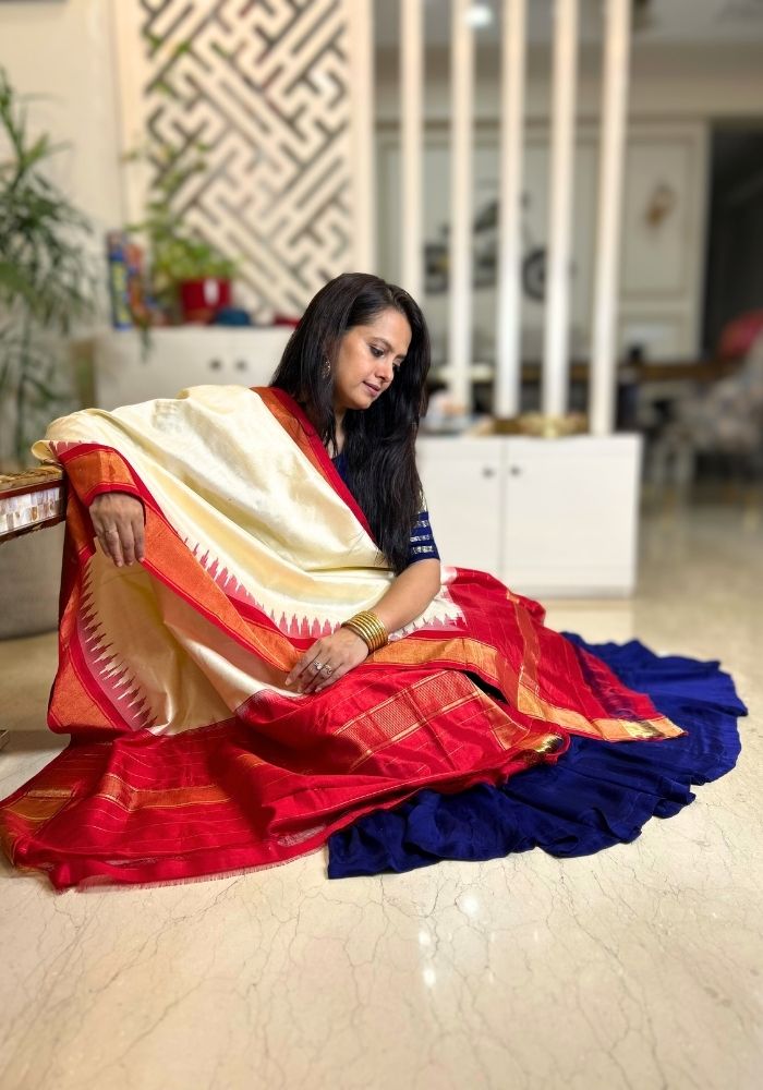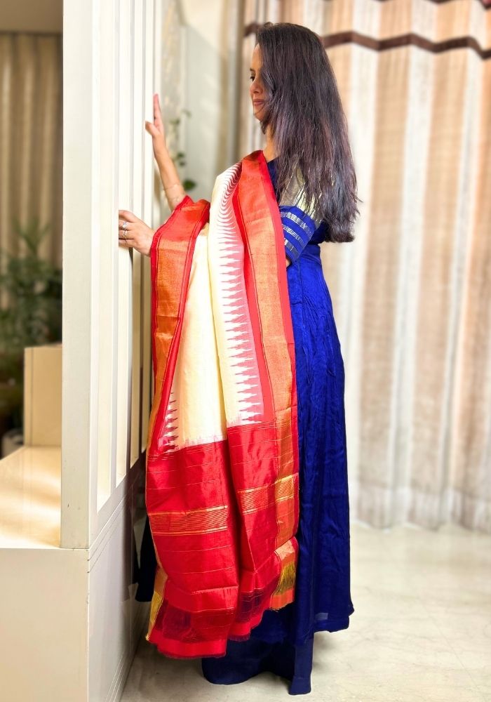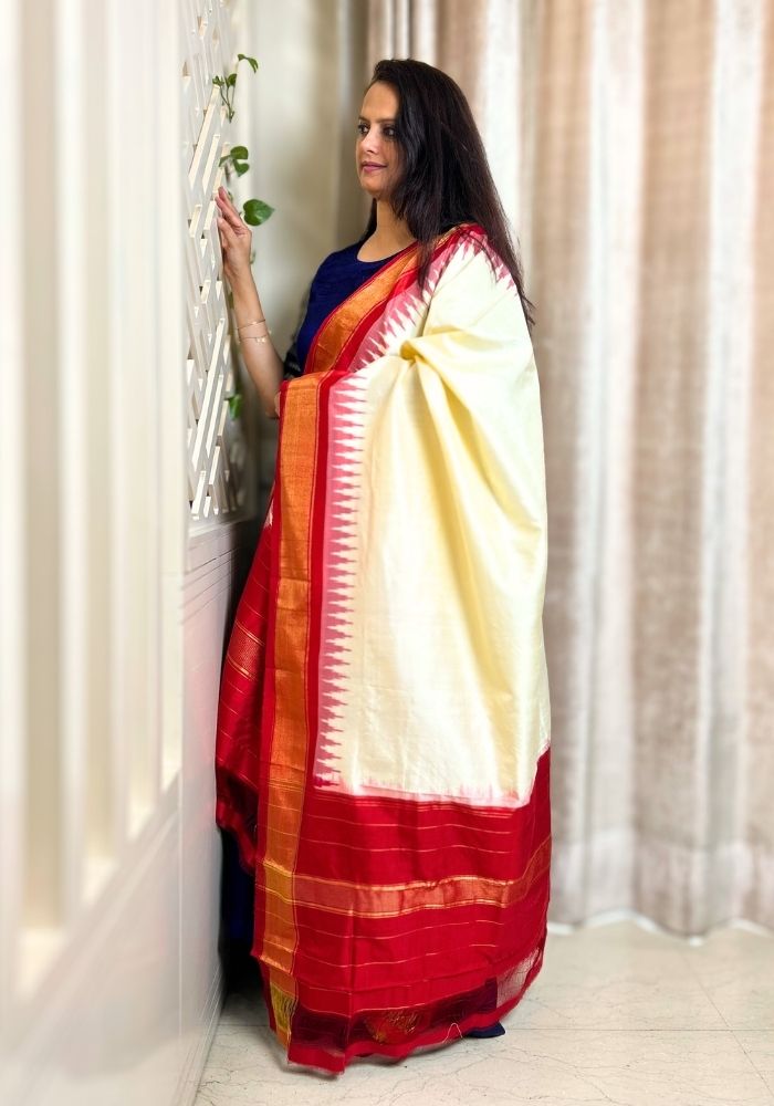Off-White & Red Pochampally Temple Border Mulberry Silk Dupatta