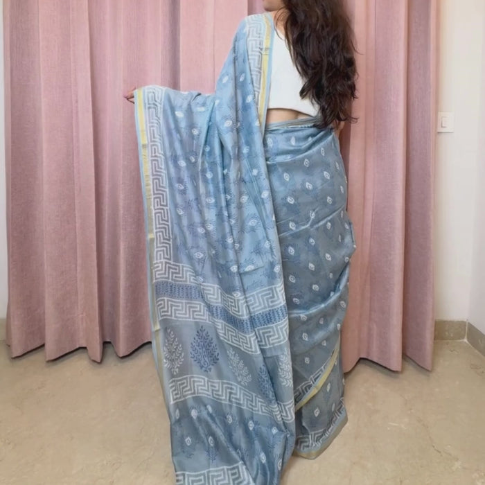 Silver Bloom – Grey Chanderi Silk Saree with Floral Block Print