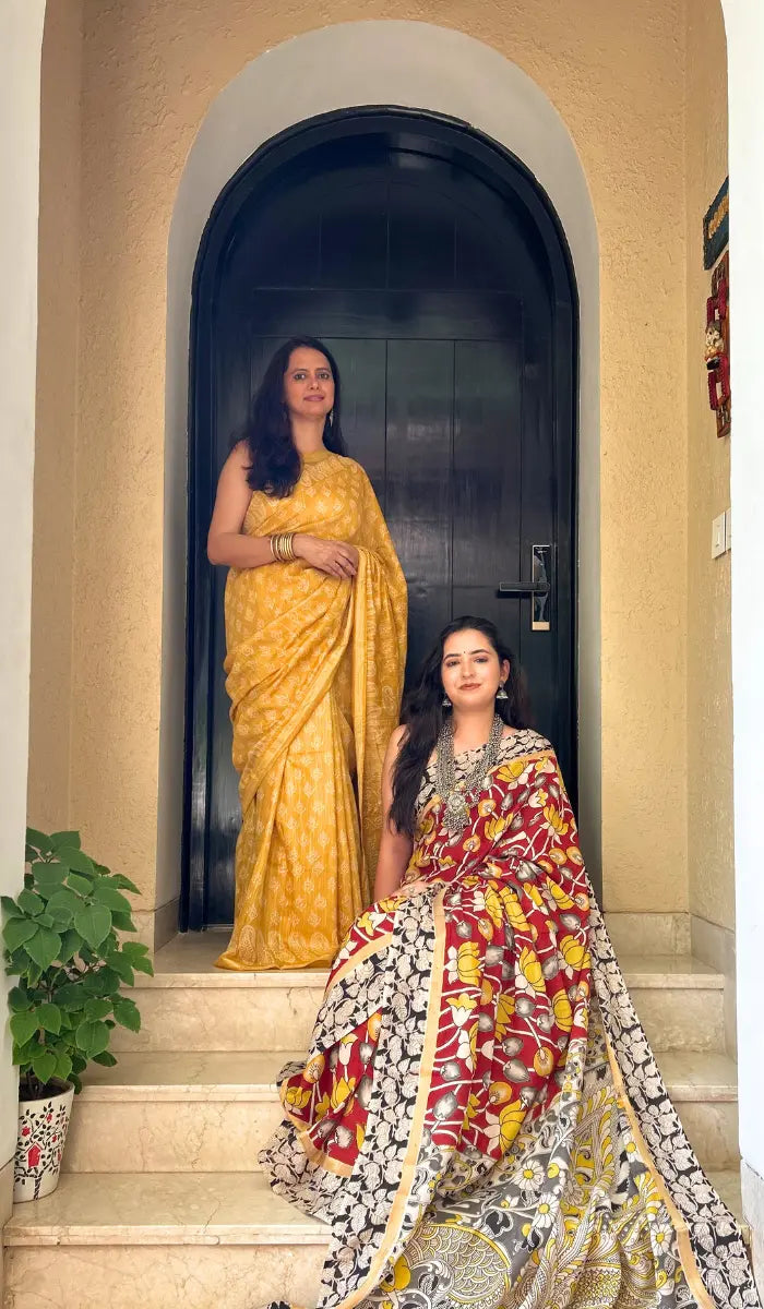 Crimson Heritage – Red Striped Modal Silk Saree with Ajrakh Hand Block Print