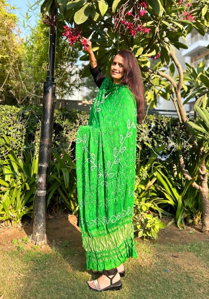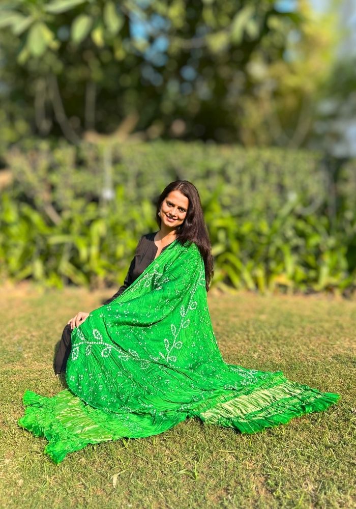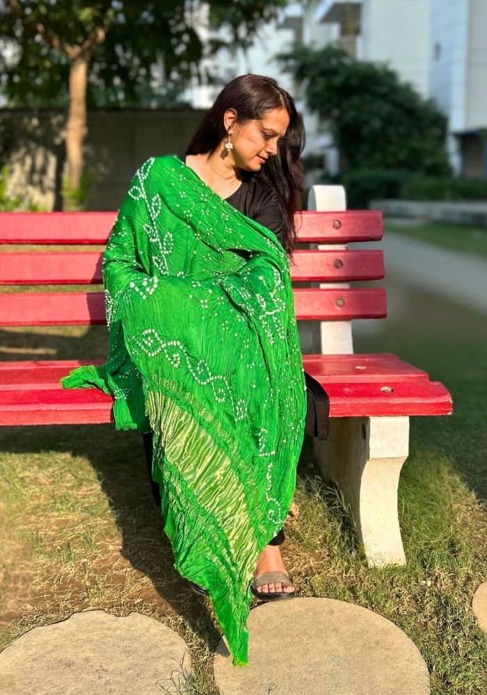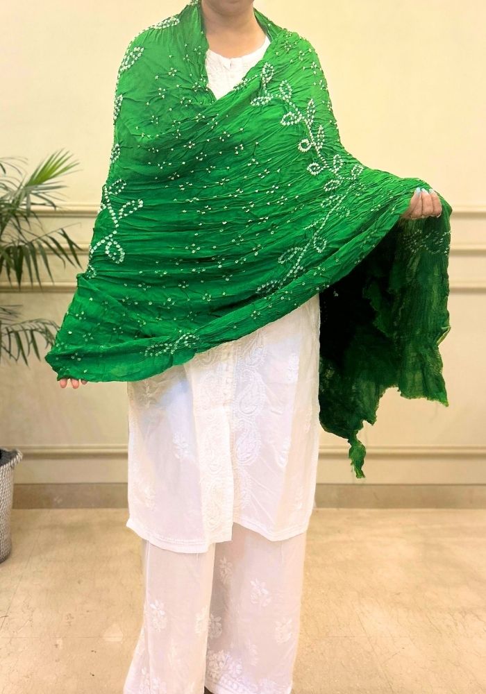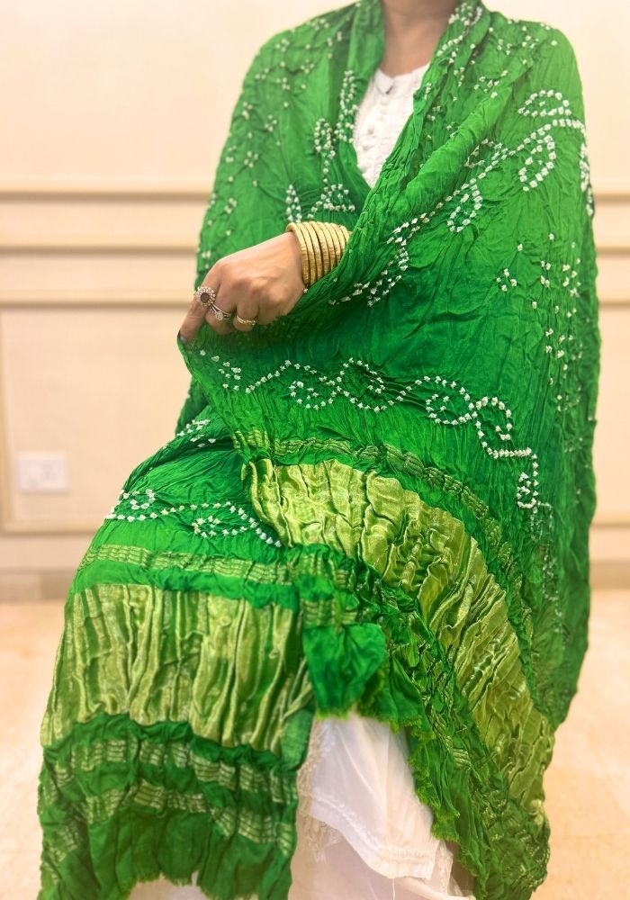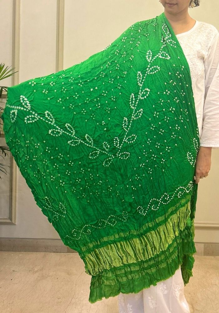 Emerald Green Pure Gajji Silk Lehriya Bandhani Dupatta with Zari Border