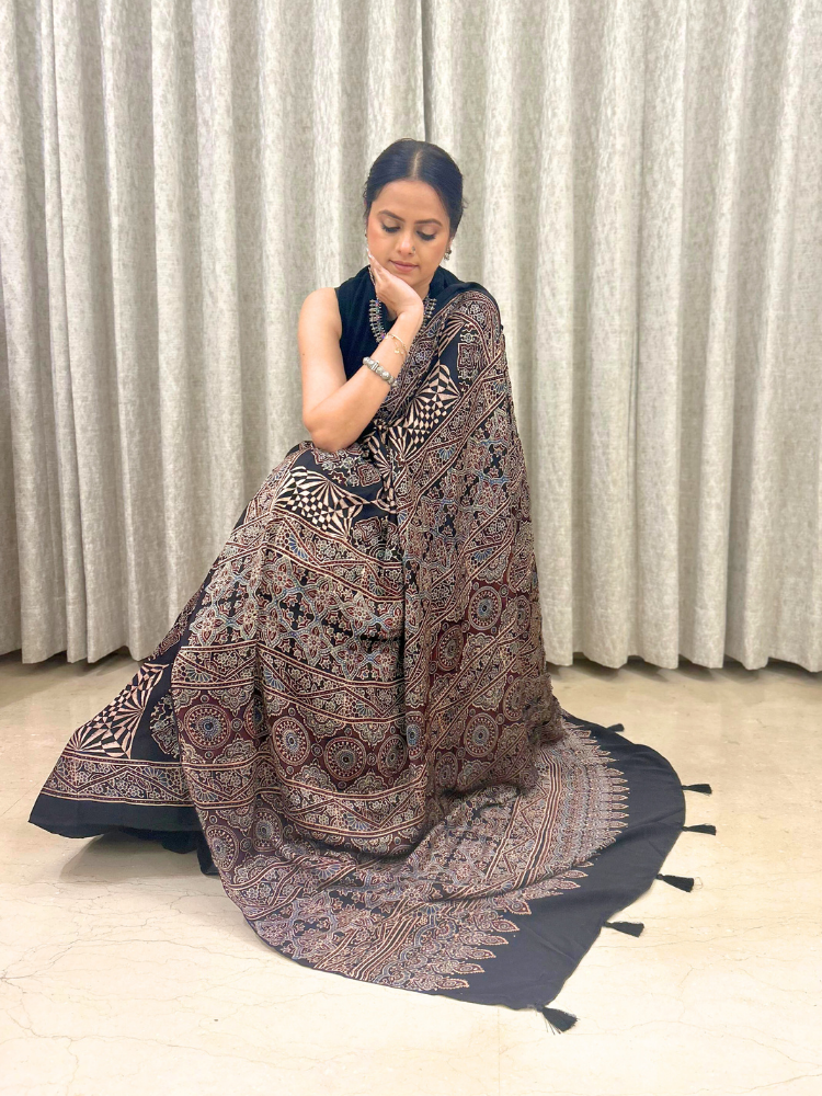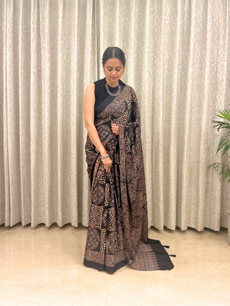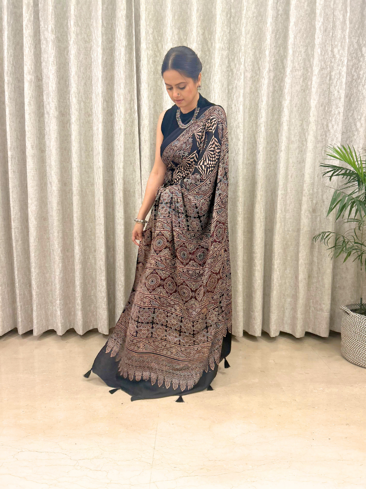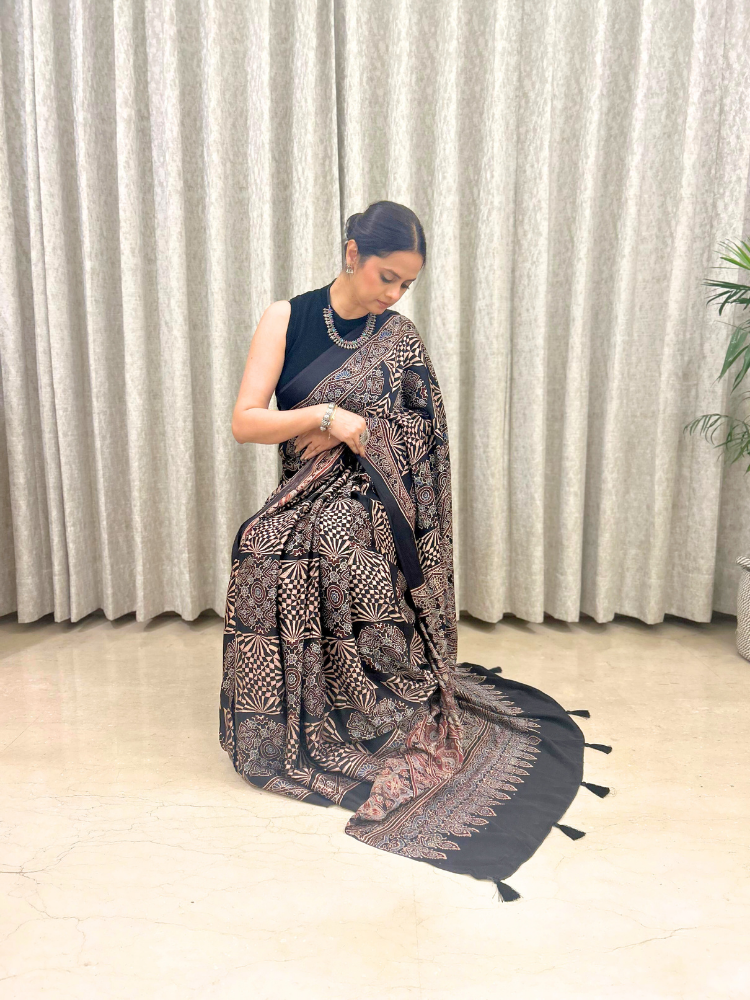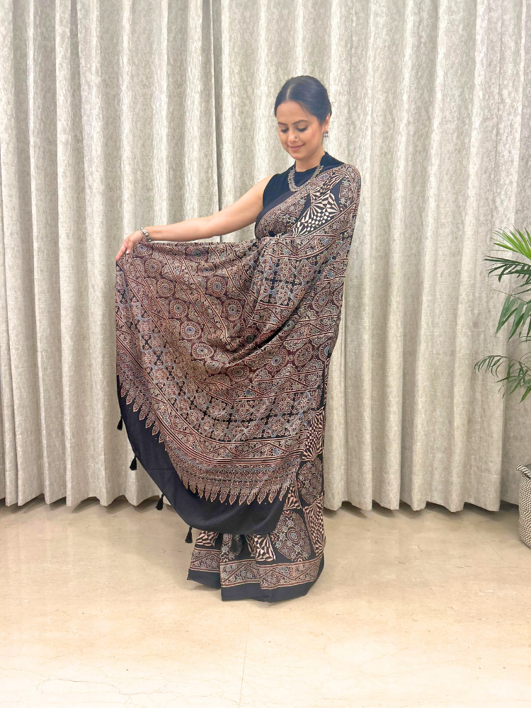 Modal Silk Ajrakh Hand Block Patterned Saree – Black