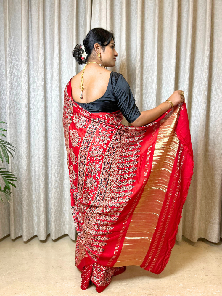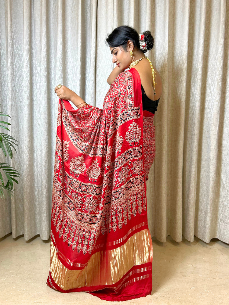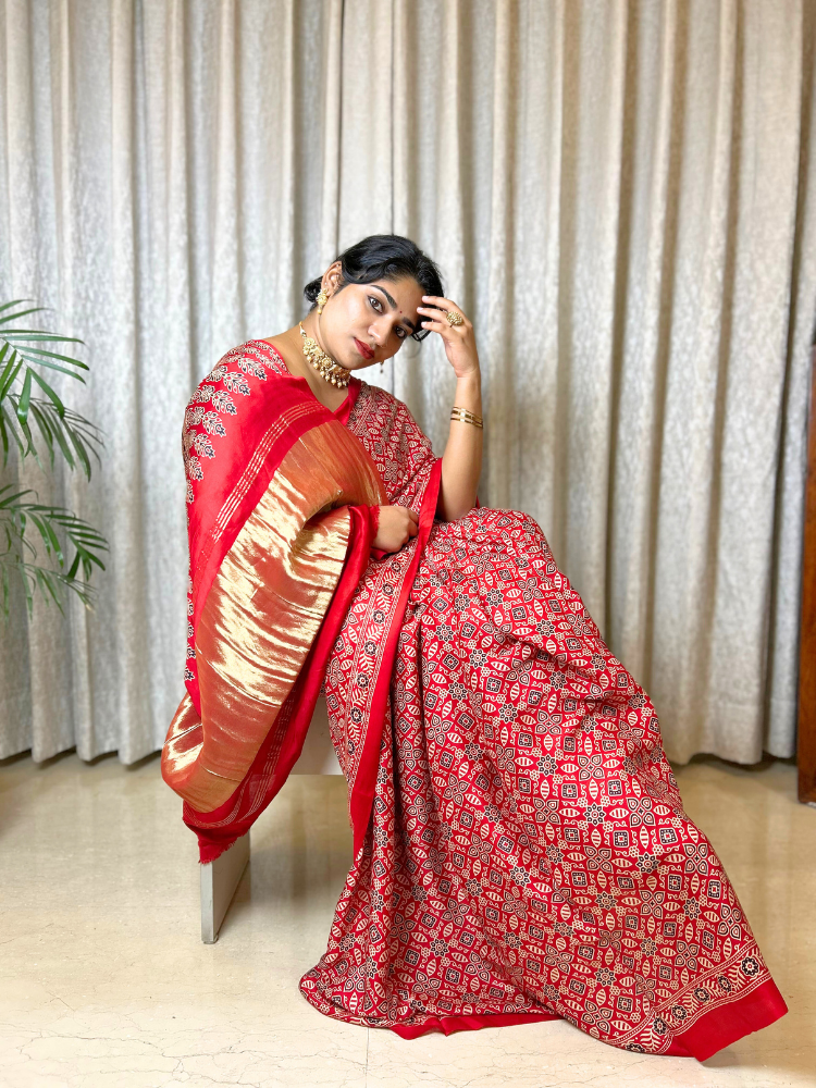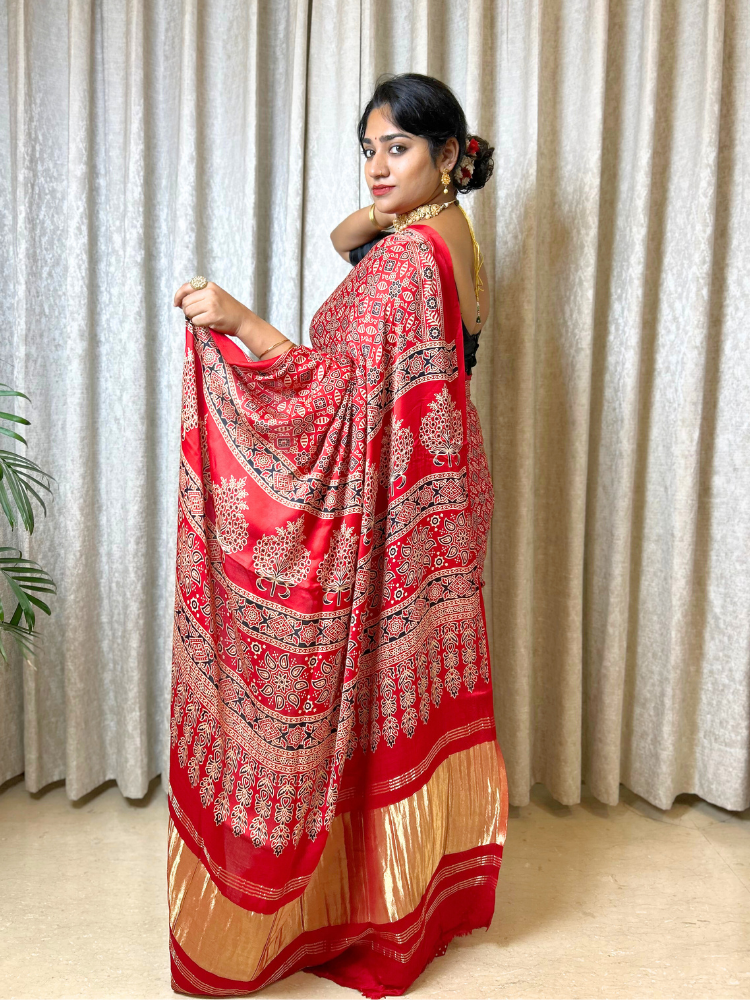 Modal Silk Ajrakh Printed Saree with Lagadi Pallu